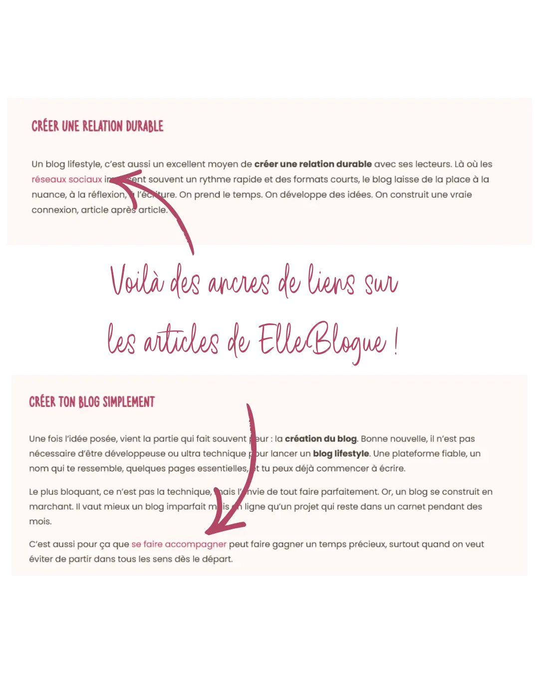 Une ancre de lien désigne le texte visible sur lequel tu vas créer un lien dans ton article. C’est un mot ou un groupe de mots ancrés dans ton contenu grâce à une balise HTML qui le rend cliquable. Sur mes articles, tu peux les reconnaître car elles sont de couleurs rose, comme ici par exemple vers le challenge gratuit.